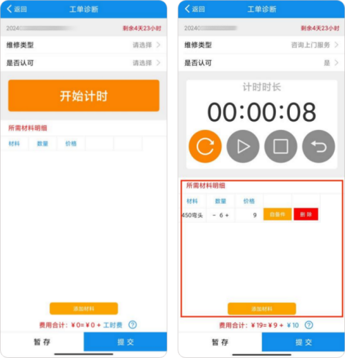 - 工时材料系统记录,结算依据清晰:维修过程中使用APP计时,材料从标准库中选择,系统自动计算费用,生成明细账单。